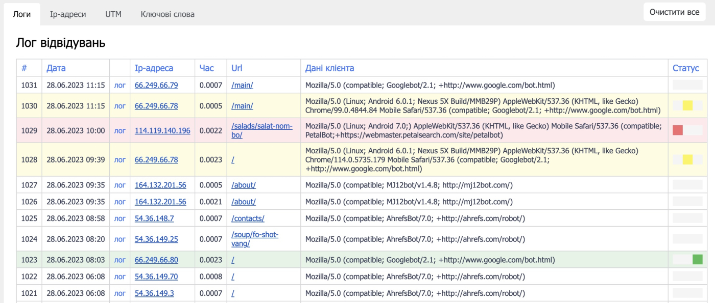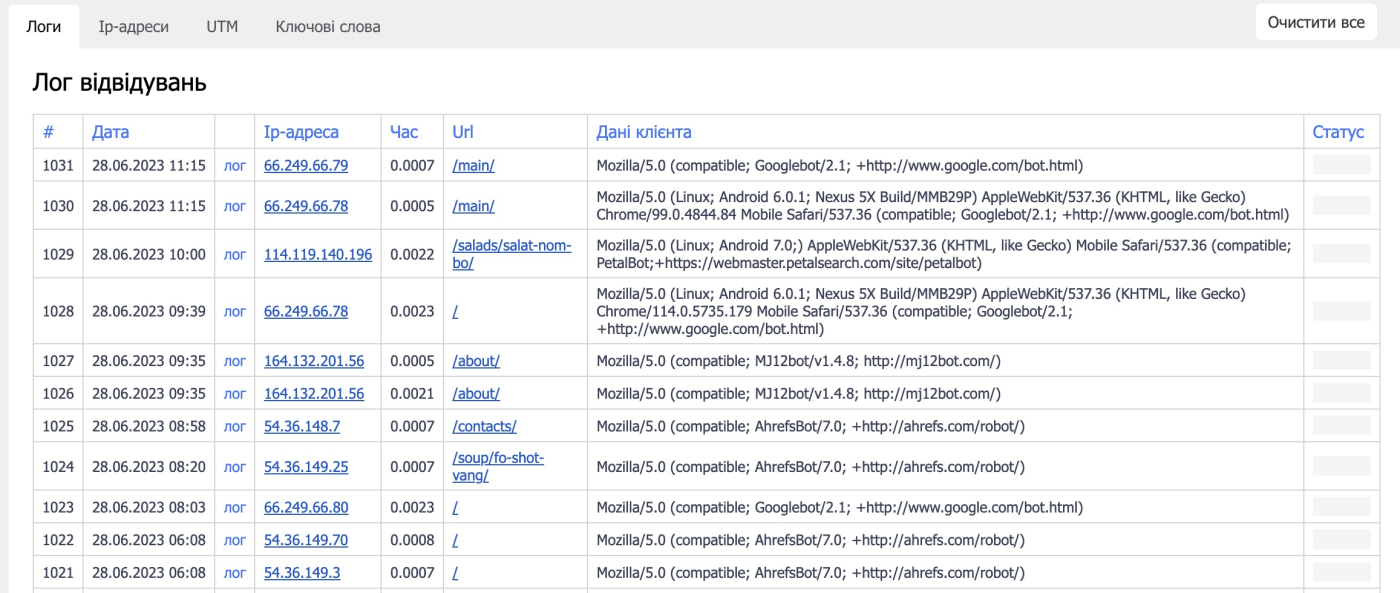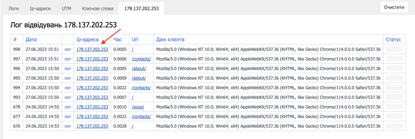 При нажатие на кнопку лог можно увидеть все посещения выбранного IP адреса